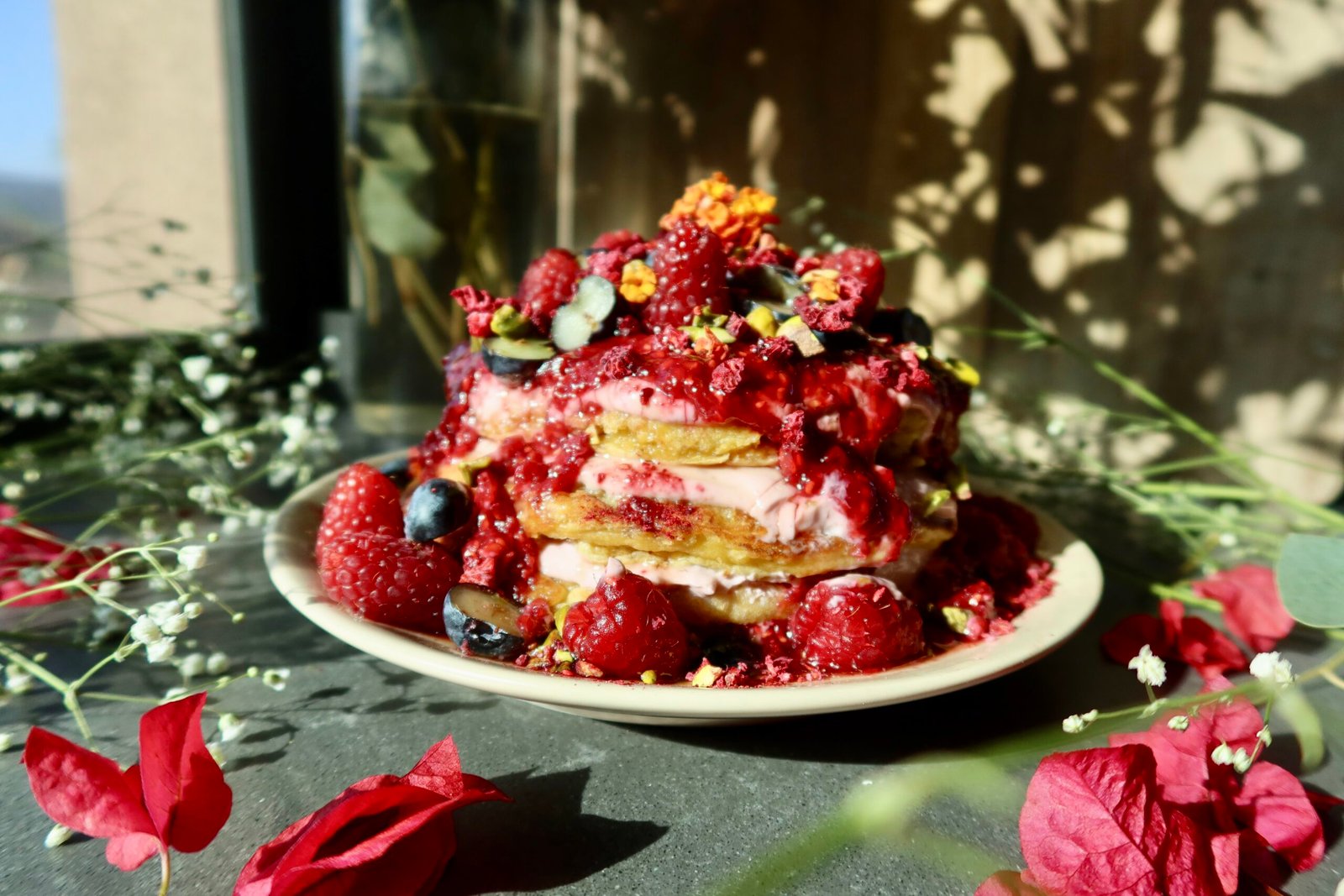 - Stack pancakes with raspberry whip between layers, spoon compote over the top, and finish with fresh berries, pistachios, and a drizzle of honey.